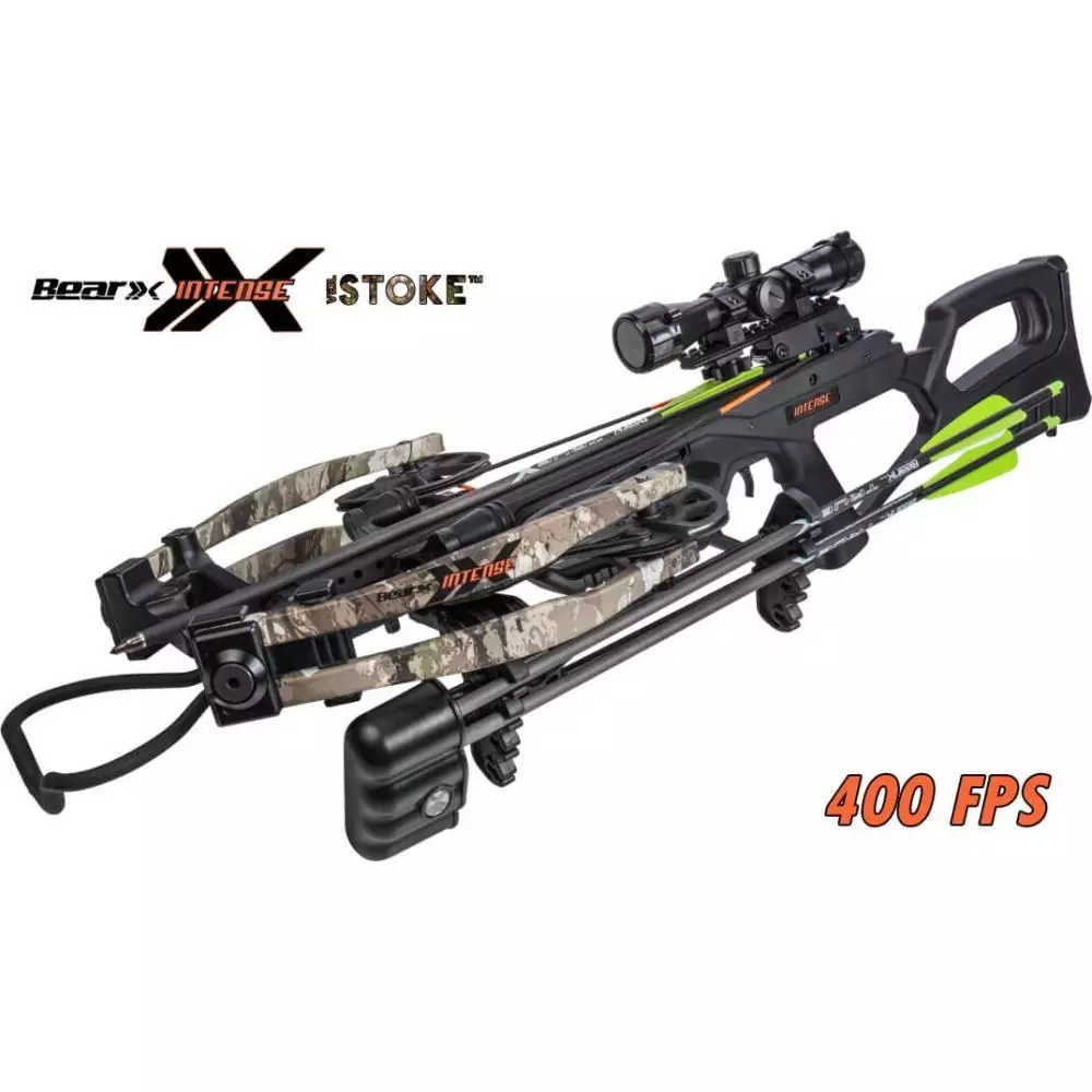 Tämä suorituskykyinen varsijousi on täydellinen paketti, sillä pakkaukseen sisältyy: 3 Bear X TrueX -nuolta, suorituskykyinen valaistu kiikaritähtäin, neljän nuolen viini, latausköysi sekä voidepuikko jänteen voiteluun.