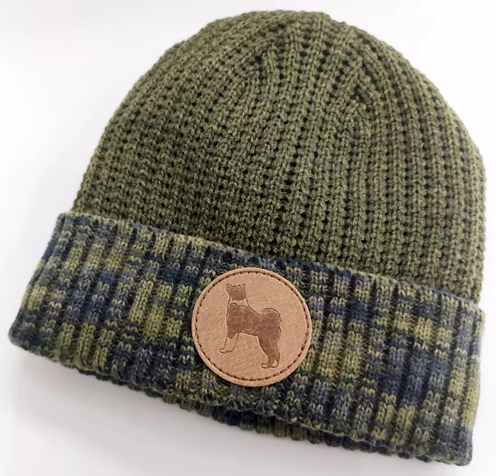 Lämmin armyvihreä pipo nahkaisella Karhukoira-merkillä. Pipon sisävuori pehmeää fleeceä.
