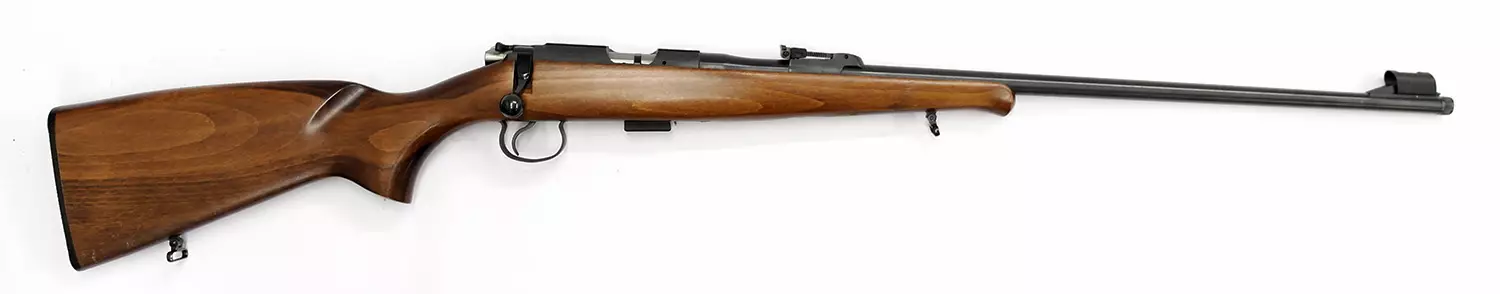Siisti CZ 452 pienoiskivääri vaimenninkierteellä ja avotähtäimillä. Aseessa irtolipas.