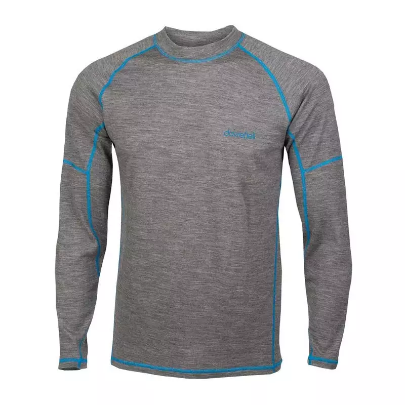 Dovrefjell merinovilla-alusasujen väri on pehmeä meleerattu harmaa, turkoosin sinisillä ompelutereillä tehostettuna.