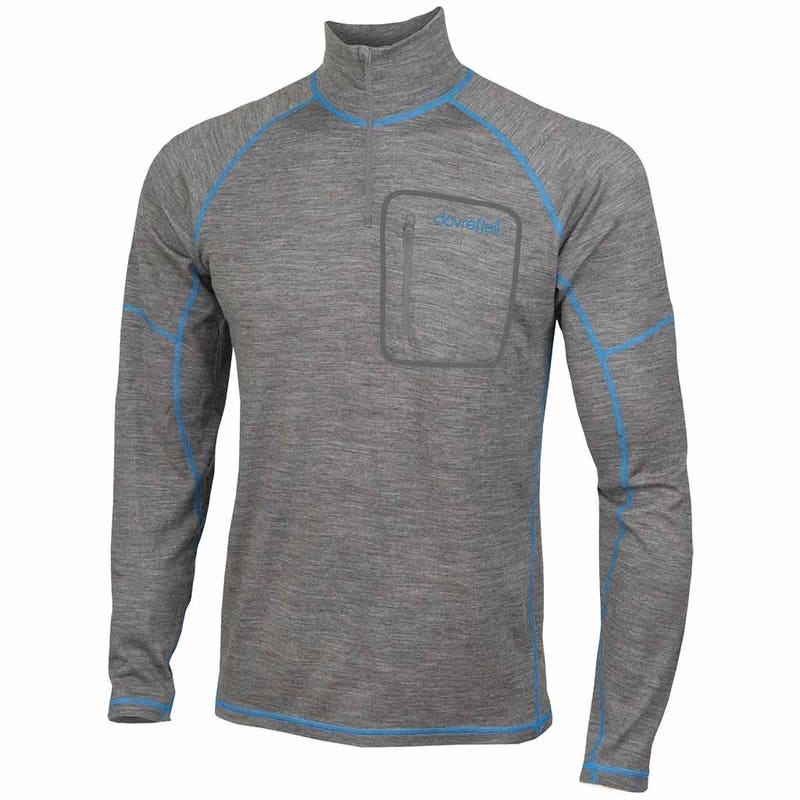 Dovrefjell merinovilla-alusasujen väri on pehmeä meleerattu harmaa, turkoosin sinisillä ompelutereillä tehostettuna.