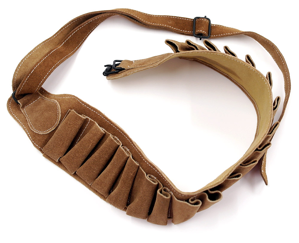 Haulikon patruunavyö 20:lle patruunalle. Vyössä laajat pituussäädöt. Materiaali: Ruskea mokkanahka.