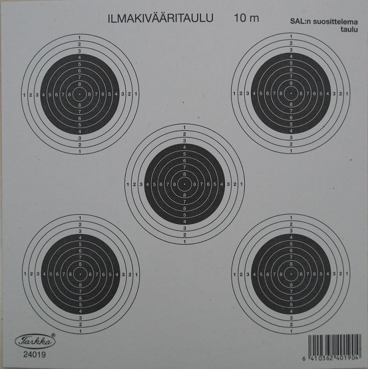 Kotimainen TARKKA ilmakivääritaulu, jossa 5 eri maalitaulua jokaista kartonkia kohden. Taulut ovat ns. virallisia eli ennätyskelpoisia.