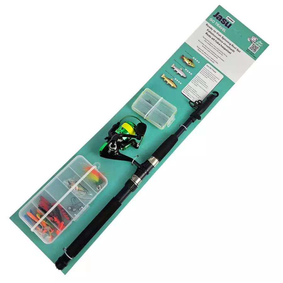 Jasu Go Travel on Eumerin kalastusoppaiden suunnittelema setti jalokalan koskikalastukseen, mutta se toimii mainiosti myös ahvenen kalastukseen merellä ja järvellä. Se sisältää avokelasetin, jossa on teleskooppivapa, kela ja kelalle valmiiksi puolattu kestävä kuitusiima. Mukana tulee myös kaloille maistuvat vieheet ja jigit. Osa vieheistä on Eumerin omaa tuotantoa ja valmistettu Merikarvialla/Suomessa! Vieheet ja pikalukot pakkasimme sinulle valmiiksi näppäriin rasioihin, missä ne pysyvät jatkossakin tallessa ja hyvässä järjestyksessä. Tämä virvelisetti menee teleskooppivavan ansiosta hyvin pieneen tilaan, joten se on näppärä ottaa mukaan reissuille. Setin esittelyvideo löytyy YouTubesta. Videolla on tarkempaa tietoa setin sisällöstä, käyttöönotosta ja kalastustekniikoista.
