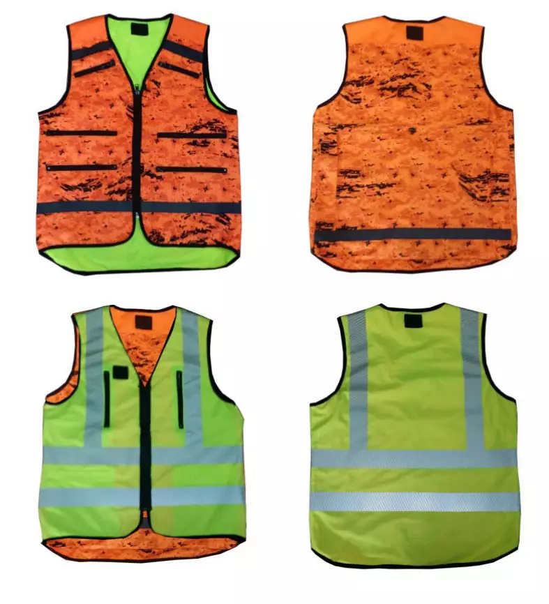 * Huomio-oranssi digitaalicamokuosinen liivi mustilla heijastinnauhoilla sekä keltainen huomioliivi hopeilla heijastinnauhoilla