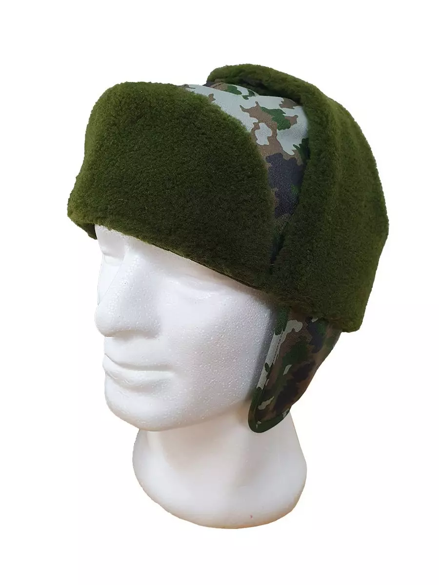 Perinteinen armeijamallinen karvahattu alaslaskettavilla korvaläpillä. Kovaan tuiskuun mahdollista taittaa leuan alle isommatkin läpät, jotka pysyvät varmasti paikallaan tarrakiinnityksen ansiosta. Hatussa lämmin vuori.