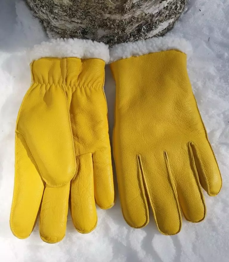Vuohennahkainen lämmin talvisormikas teddyvuorella. Väri keltainen.