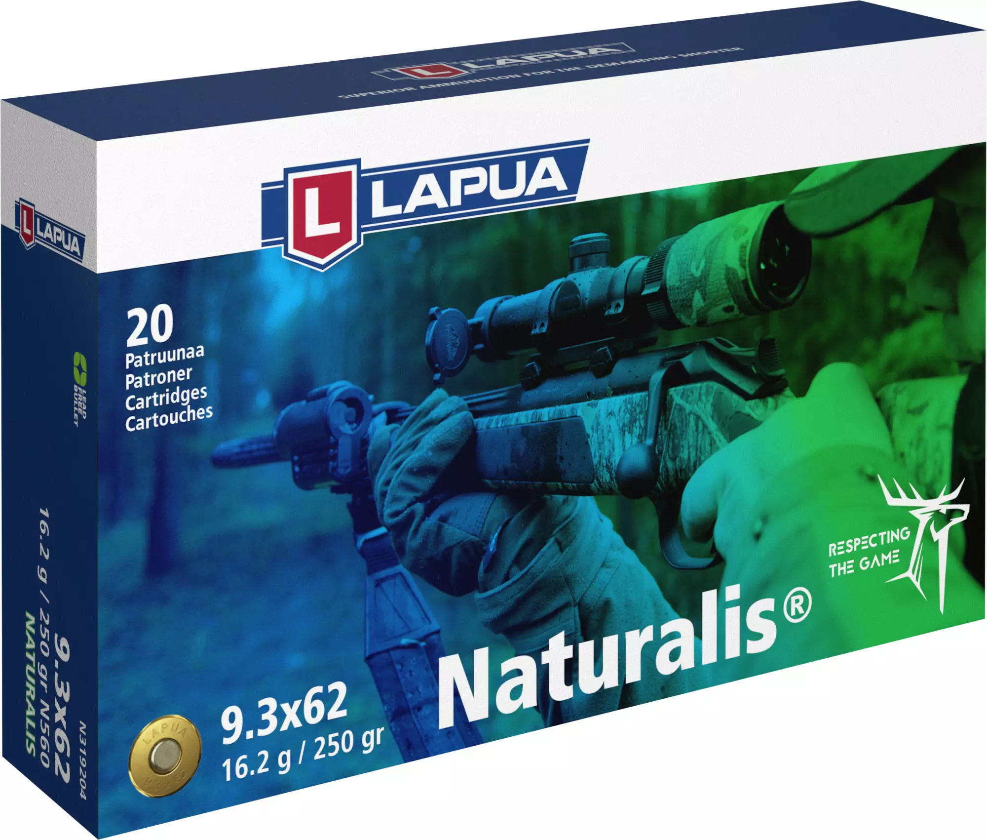 Lapua Naturalis 9,3x62 kiväärinpatruuna 16,2g täyskuparisella, laajenevalla luodilla. Naturalis-luoti säilyttää tyypillisesti jopa 100% jäämäpainostaan, laajenee kaksinkertaisesti alkuperäisestä läpimitastaan ja omaa hyvän tunkeuman. 20 kappaleen rasiassa.