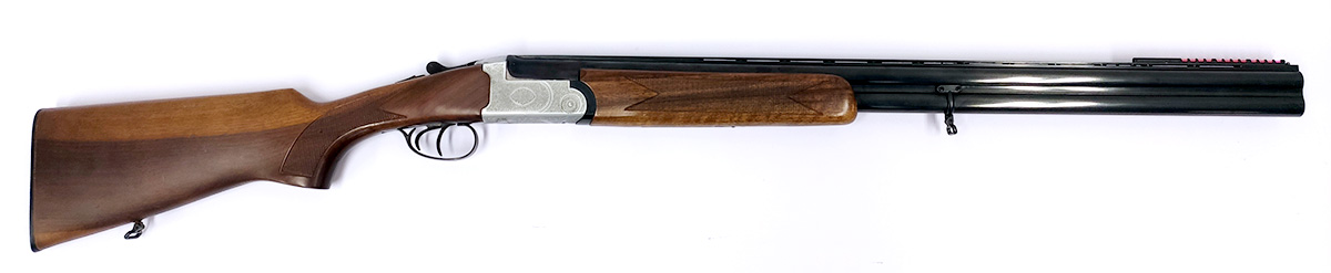 Päällekkäispiippuinen Italialainen haulikko kahdella liipaisimella ja kiinteillä supistuksilla(puolisuppea ja täyssuppea). Aseen kiskoon liimattu punainen kuitujyvä.
