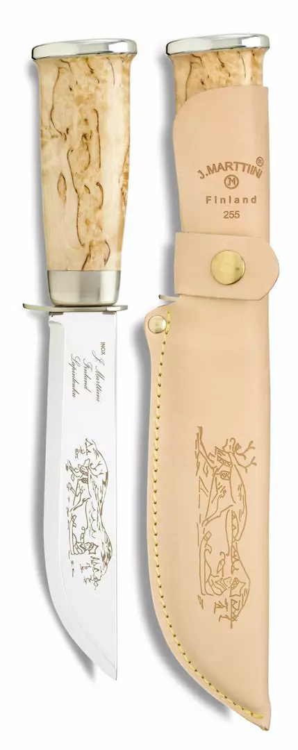 Marttiini Lapinleuku 255 sormisuojalla Lapinleuku 255 on kooltaan jo jykevämpää tekoa niin kahvan kuin teränkin osalta. Ruostumaton kromiterästerä sekä nahkatuppi on kuvioitu perinteisin... Lue lisää