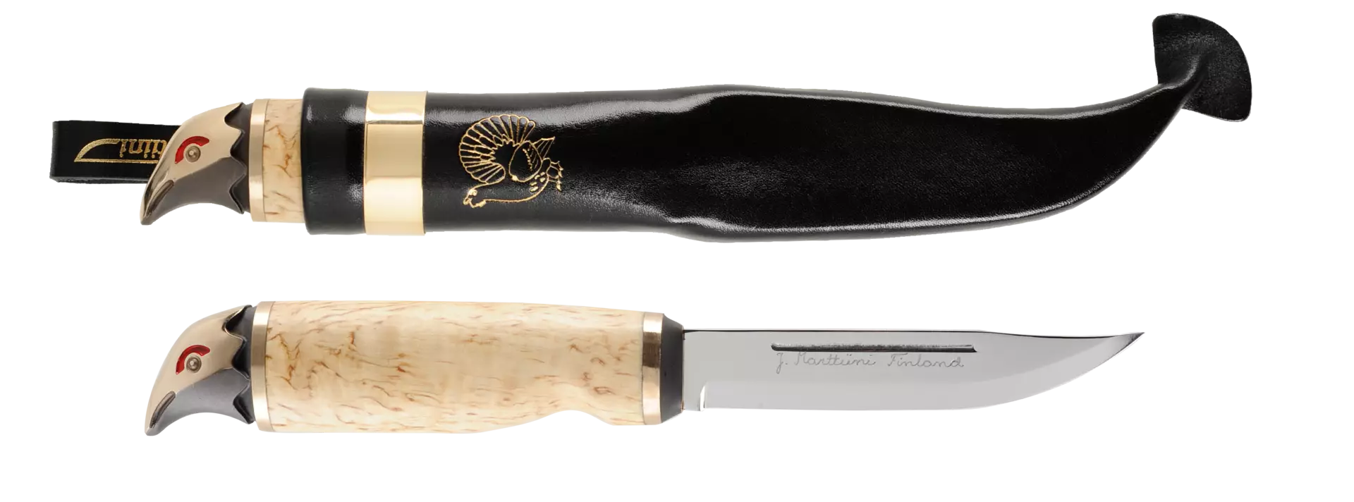 Suomen linnuston jaloimpiin kuuluva metso on ikuistettu tämän puukon kahvan pronssiseen helaan. Urosmetson silmiinpistävä piirre, punainen kulmakarva, on myös tämän lahjapuukon hieno yksityiskohta.