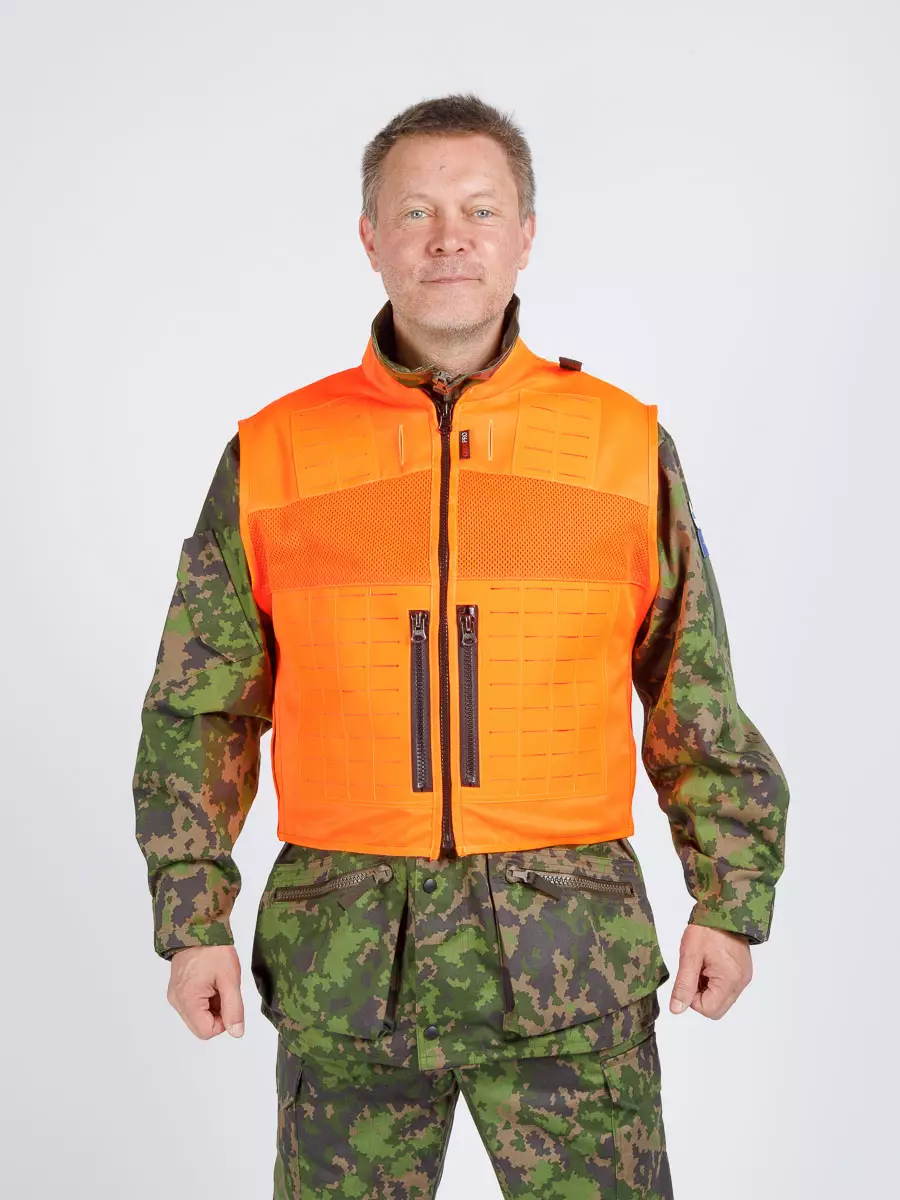 Karhuryhmä-veteraanin ja Nuka-Trail eräohjelman tuottajan Kari Jokisen kanssa yhteistyössä kehitetty metsästäjän oranssi varusteliivi. Toiminnallisuus ja käyttömukavuus ovat olleet liivin suunnittelun lähtökohtana.