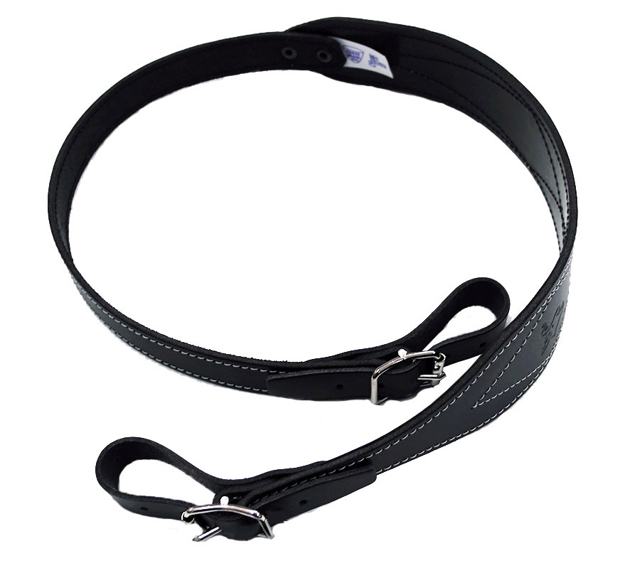 Kotimainen, leveä nahkainen asehihna. Levennyksen kohdalla kangasvahvike.