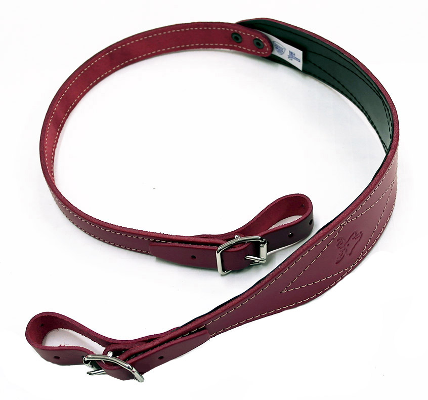 Kotimainen, leveä nahkainen asehihna. Levennyksen kohdalla kangasvahvike.