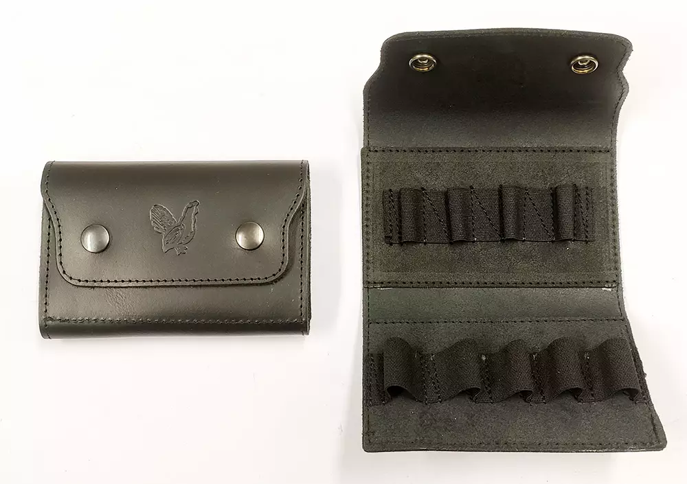 Kotimainen nahkainen patruunatasku rihlakon käyttäjälle. Taskuun menee 4 kpl kiväärin ja 5 kpl haulikonpatruunoita. Takapuolella vyölenkit (max 50mm leveä vyö).