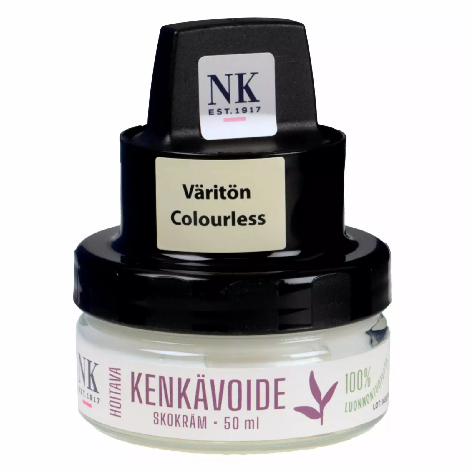 NK Kenkävoide Väritön (Neutral) 50ml Helppokäyttöinen kenkävoide levityssienellä. Kirkastaa väriä ja hoitaa nahkaa. Levitä voidetta mukana olevalla sienellä kengän nahkaan ja anna kuivua.... Lue lisää