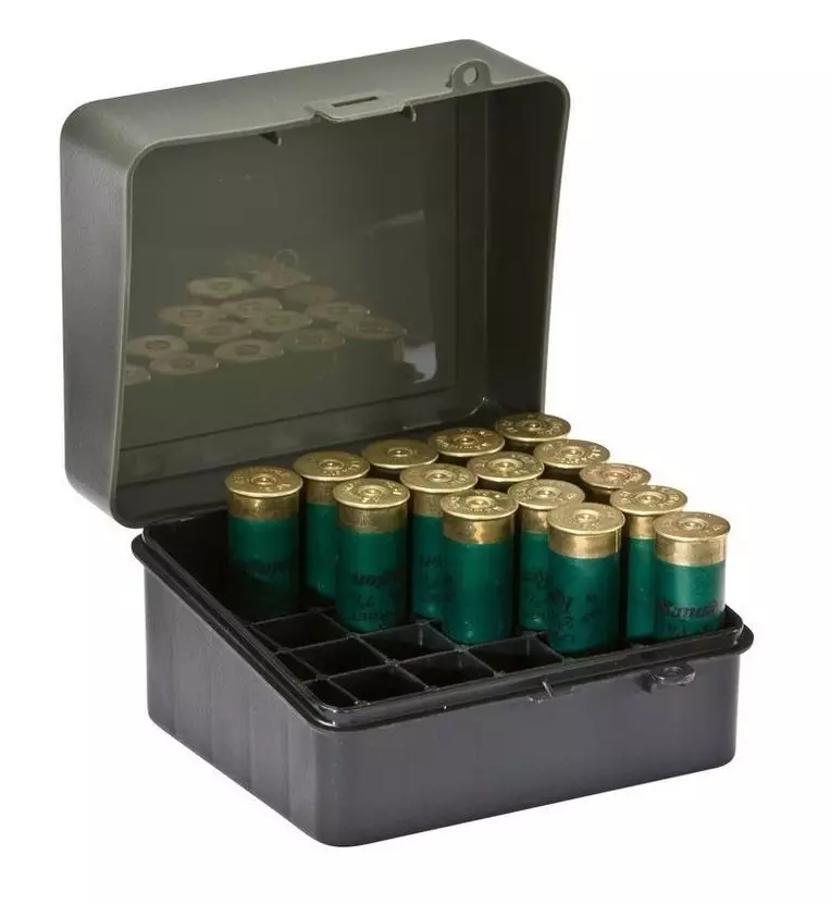 Plano Haulikko patruunarasia *Kestävää muovia *Lokerot 25:lle patruunalle, max 30kpl *12/16GA 70-89mm 2 3/4 - 3 1/2 *Mitat: 14.3 x 13.5 x 8.6cm *Väri: Musta/Vihreä