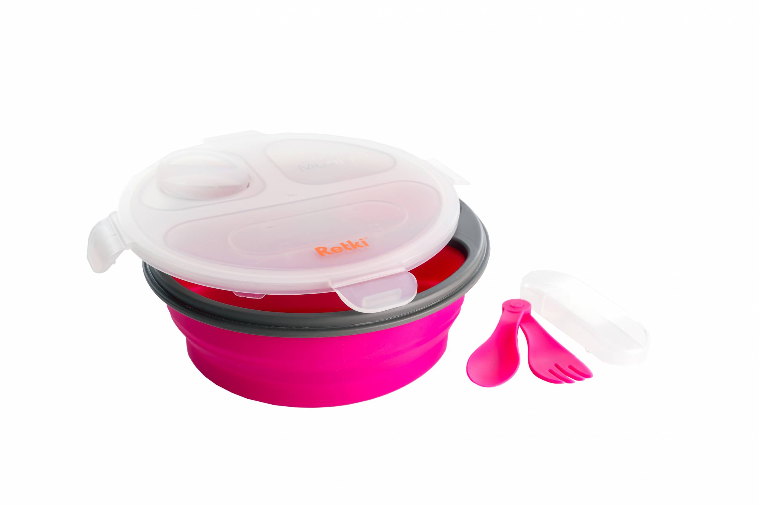 Silikonirasia on kokoonpantava, sen 3-osainen rasiaosa voidaan laajentaa ja kutistaa tarpeen mukaan. Kannessa pienempi erillinen säilytysosa esim. dipille, ketsupille tai pähkinöille yms. Mukana lisäksi lusikka-haarukkayhdistelmä.
