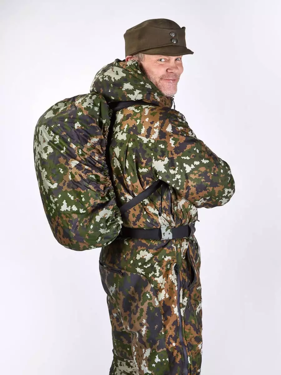 M05 pakkaskuvio maastouttaa repun tai rinkan loppusyksyn kuuraiseen ja alkutalven lumiläikkyiseen metsäympäristöön.
