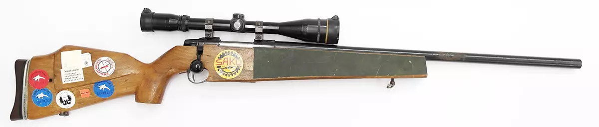 Kisoja nähnyt sakolainen. Raskaalla piipulla sekä ratatukilla varustettu Sako AII kivääri. Aseen päällä Burris 6-18x kiikari teräsjaloilla sekä Butler Creekin läppäsuojilla. Aseessa 5 patruunan irtolipas.