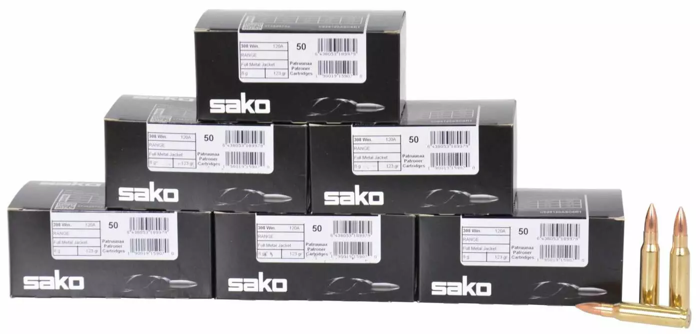 Sako Range .308win 8g 123gr 50kpl * Rasiassa 50 kpl patruunoita * Kaliiperi: .308 win * Luoti: 8 g (123 gr) FMJ 120A * Lähtönopeus V0: 890 m/s