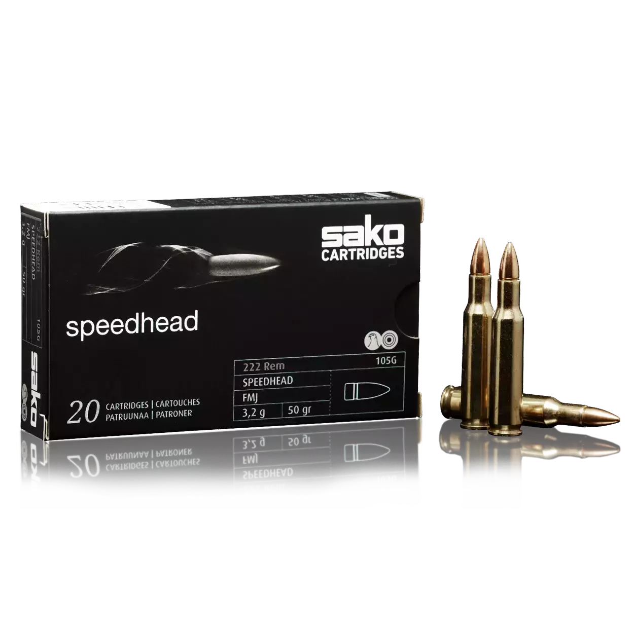 Sako Speedhead .222Rem 3,2g 50gr 20kpl * Rasiassa 20 kpl patruunoita * Kaliiperi: .222 Rem * Luoti: 3,2 g (50 gr) FMJ 105G * Lähtönopeus V0: 970 m/s