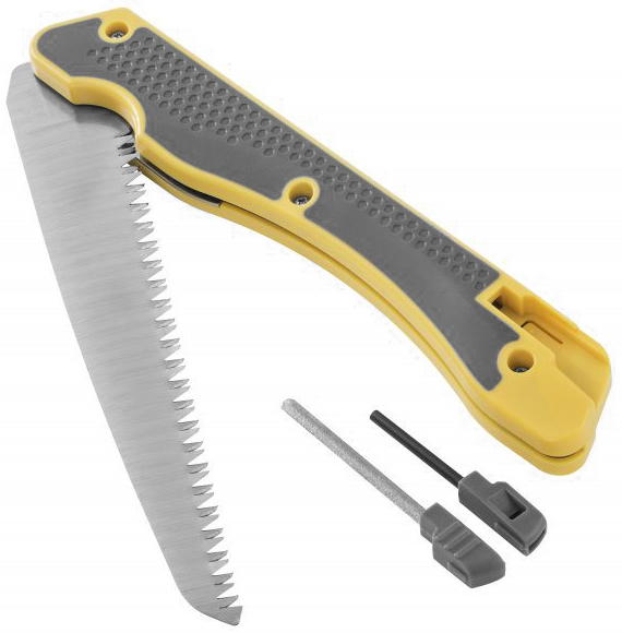Kätevä retkisaha tuluksilla ja teroituspuikolla. Pitävä kumitettu kahva. Kompaktin kokonsa ansiosta helppo kuljettaa mukana.