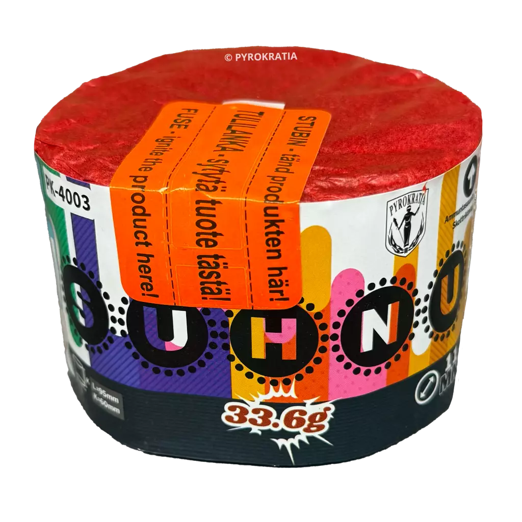 Suhnu pata Suhnu muistuttaa perinteistä satatähtistä, ilman irtoilevaa jalkaa. * Pyromassa: 33,6g * Laukauksia: 96 kpl * Kaliiperi: 11mm * Kesto: 20s