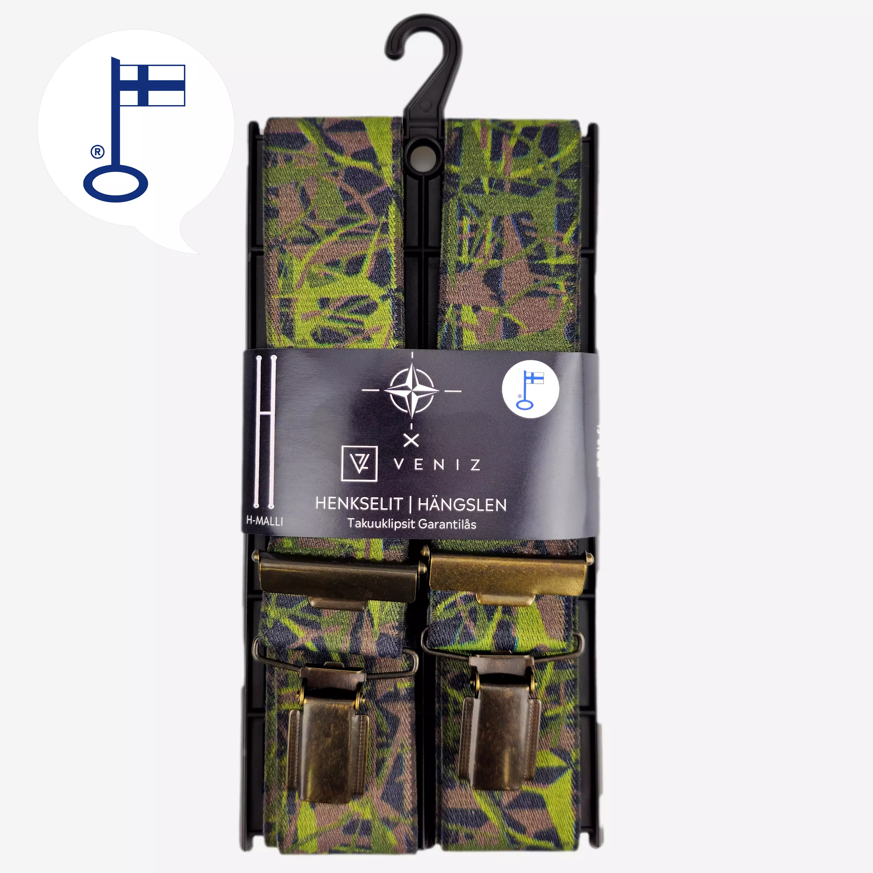 Veniz Klipsihenkselit 36mm Maastokuvio NATO 120cm Henkseleissä on laadukkaat nikkelivapaat takuu klipsit. Säädettävä pituus 120cm asti. Henkselit on valmistettu joustavasta materiaalista.... Lue lisää