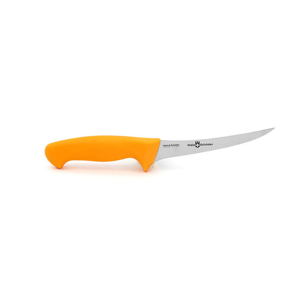 Walz & Schöder:in miellyttävä synteticgrip kahvainen boningveitsi, jossa 16cm pitkä ja joustava terä. W+S fileointiveitsi on erittäin hyvä työkalu erityisesti metsästäjille ja kalastajille, luisen lihan renssaukseen sekä kalan fileointiin. Laadukas terä on saksalaista alkuperää, valmistettu ruostumattomasta 1.4116 materiaalista. Terän kovuus ja sitkeys ( 56 HRC ) pitää terän terävänä pitkään, vähentää teroitustarvetta sekä ennen kaikkea se merkitsee pitkää käyttöikää. Terän sekä kahvan muotoilu vähentää huomattavasti loukkaantumisen riskiä käytössä. Kahva on miellyttävä käteen sen pehmeän olemuksen ja materiaalin ansiosta. Voidaan puhdistaa aina 120°C/250F lämpötiloissa.