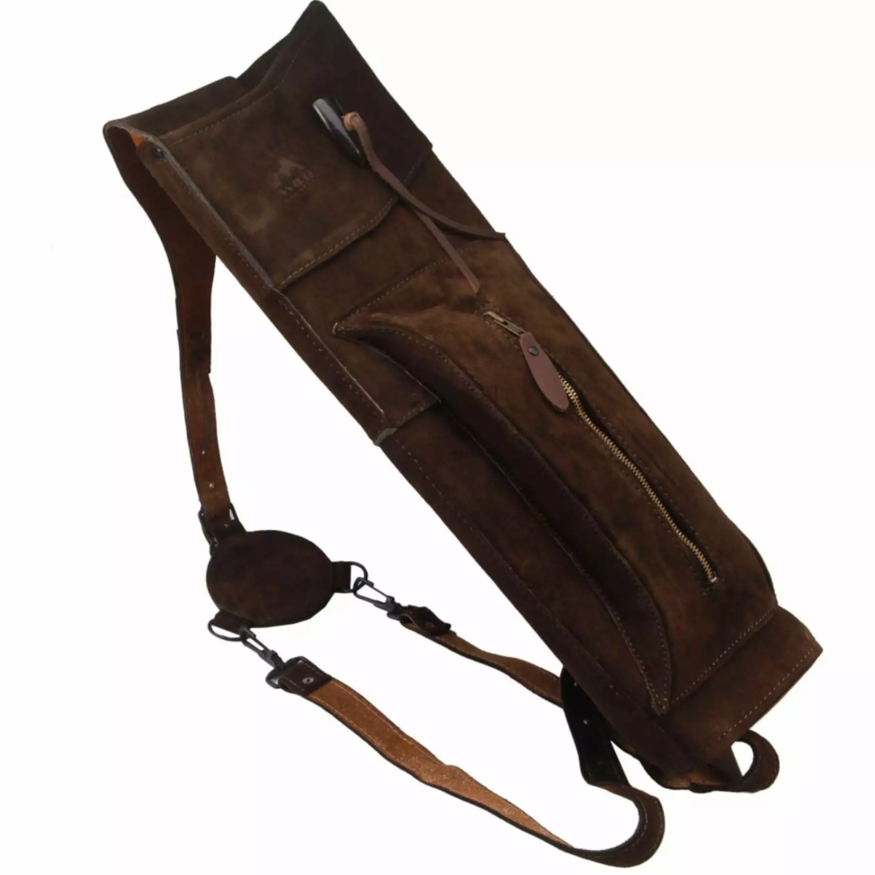 Tummasta nahasta valmistettu suurikokoinen selkäviini, pitää nuolet järjestyksessä ja matkassasi.